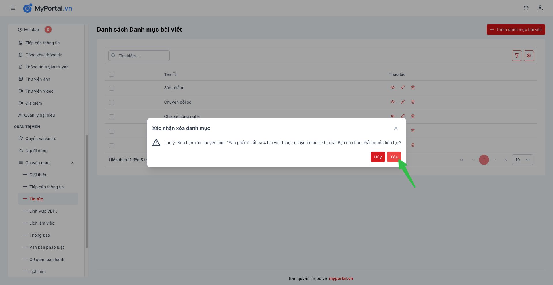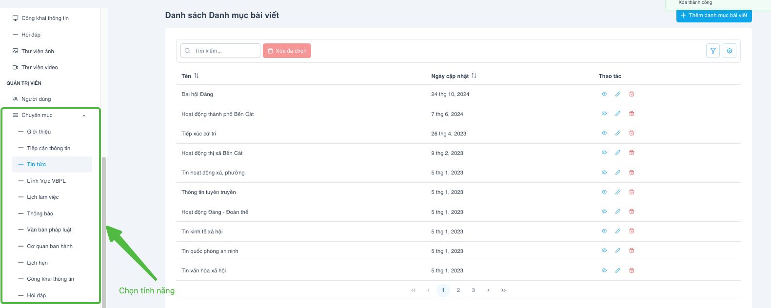 Bước 3: Bấm Xoá để xoá Chuyên mục đã chọn