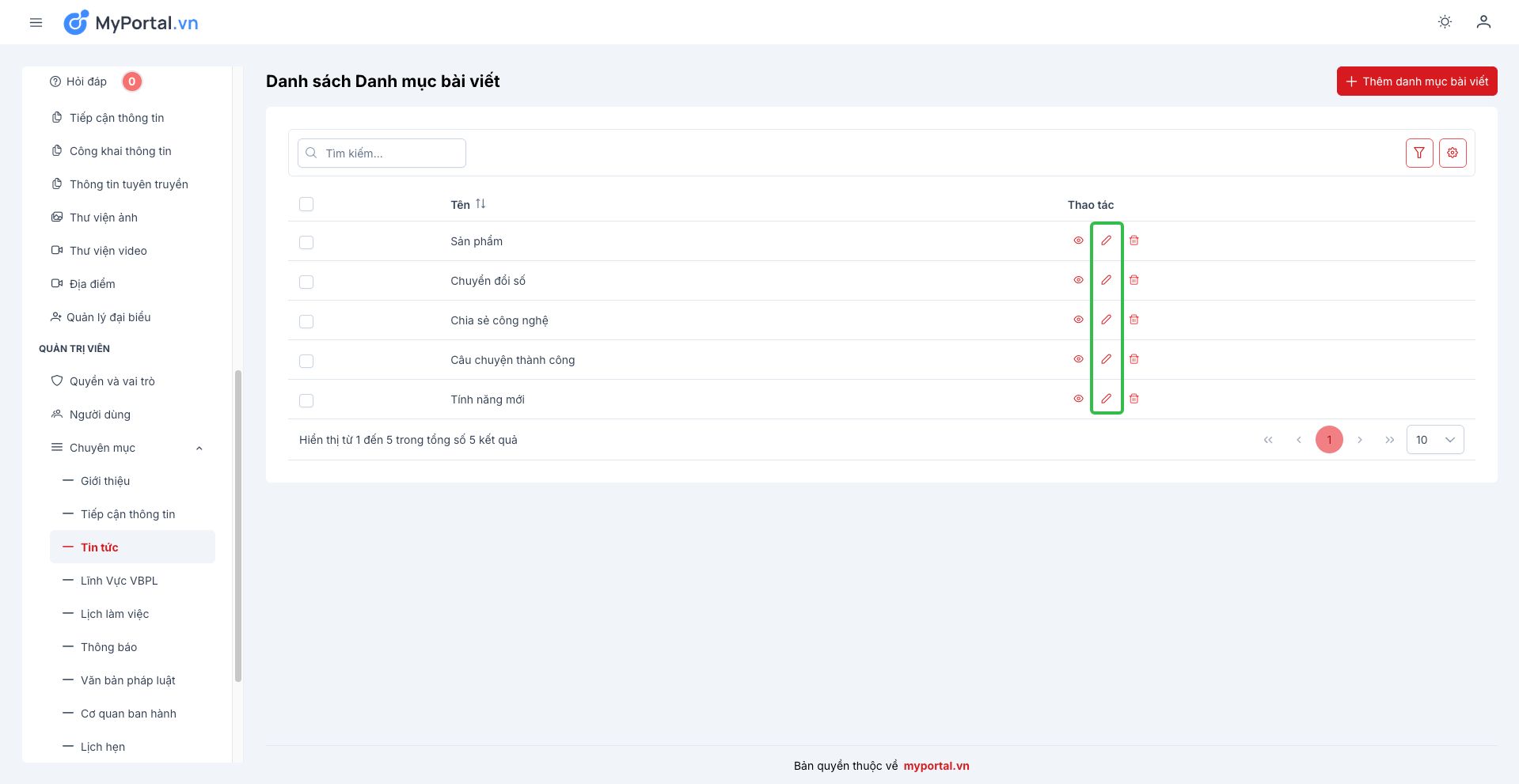 Bước 2: Click nút Chỉnh sửa tại Chuyên mục cần chỉnh sửa