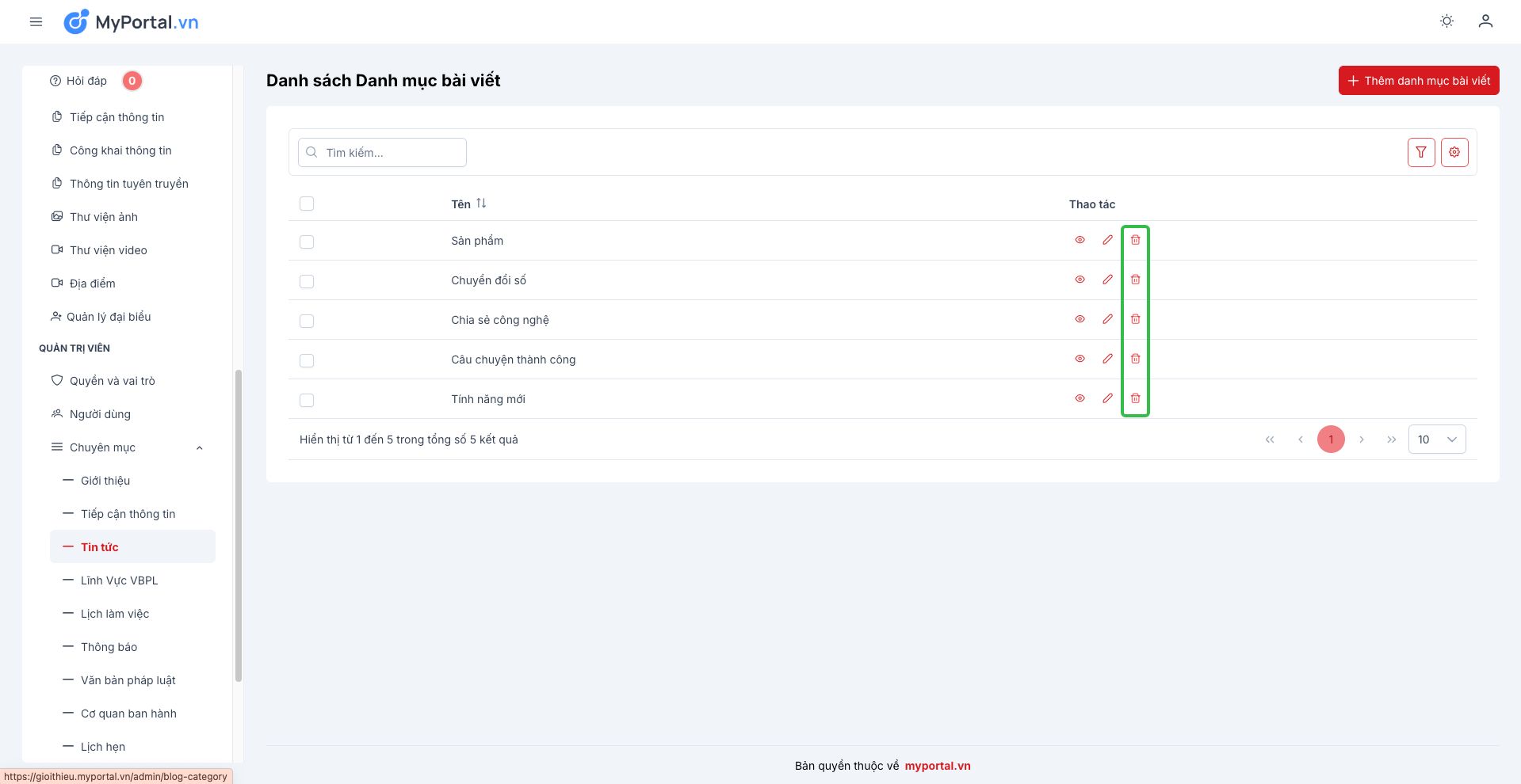 Bước 2: Click nút Xoá tại Chuyên mục cần xoá